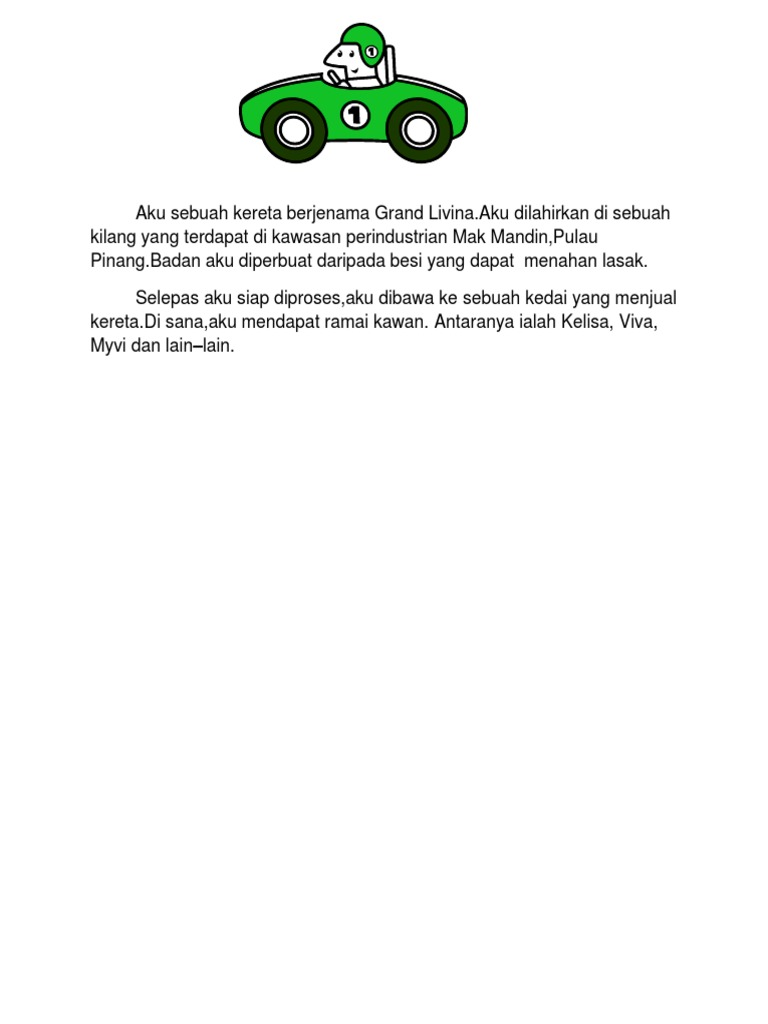 Aku dibuat di sebuah kilang. Aku Sebuah Kereta Aku sebuah kereta. Kuiz Karangan Autobiografi Tahun 6.